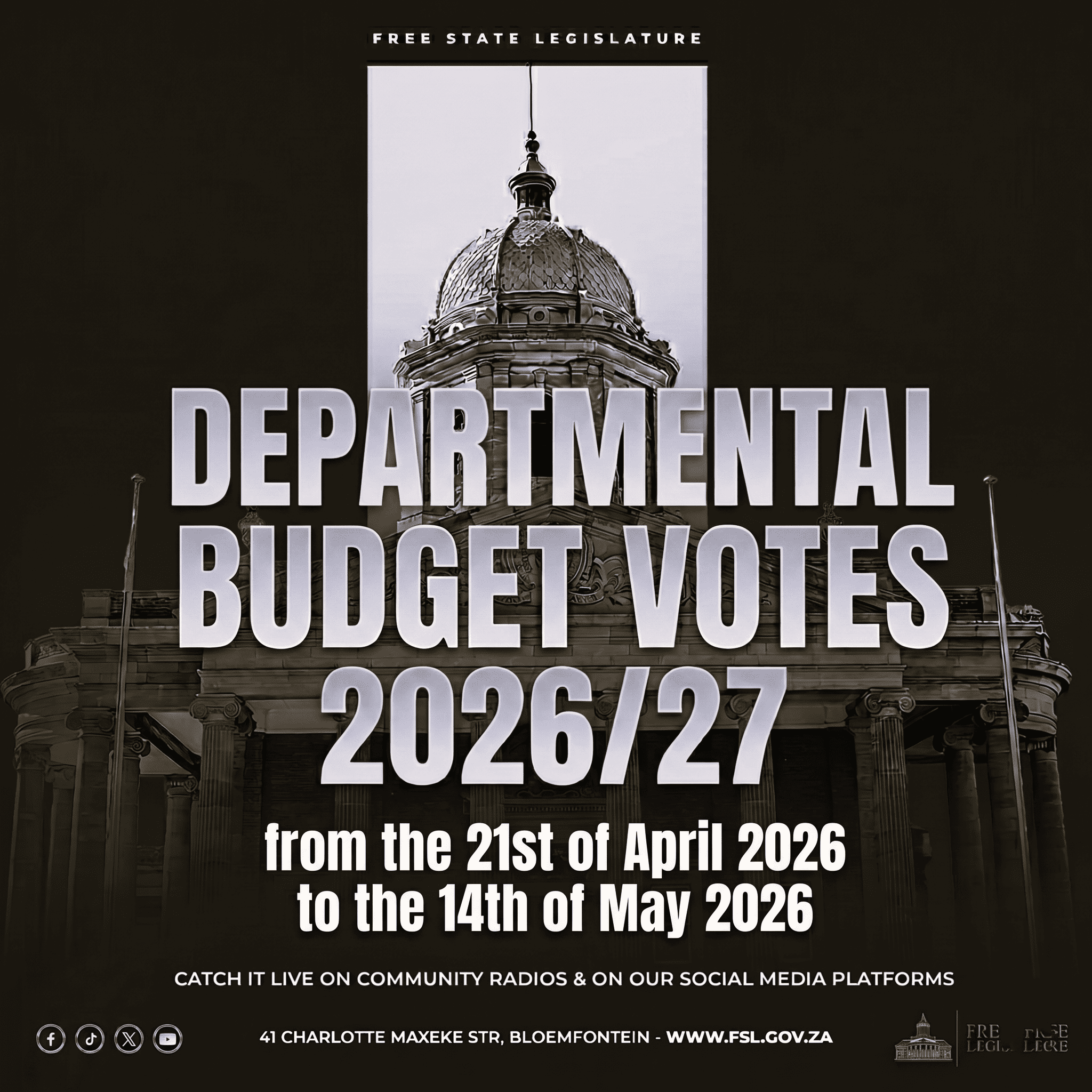 Departmental Budget Votes for 2026/27 will take place from 21 April to 14 May 2026, with sittings held across the province.